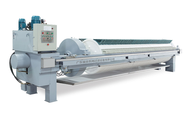 在污泥泵進(jìn)泥壓力達(dá)到設(shè)定壓力值后,污泥泵自動(dòng)停機(jī),進(jìn)泥閥自動(dòng)關(guān)閉,壓榨機(jī)的液壓系統(tǒng)自動(dòng)啟動(dòng),對(duì)進(jìn)入濾腔的污泥進(jìn)行二次壓榨,壓力高達(dá)65——110kg/cm2,濾室自動(dòng)調(diào)節(jié)壓縮,使濾餅在高壓力壓榨下將濾餅中的大部水?dāng)D出