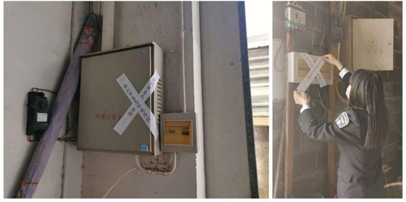 執(zhí)法人員依法對龍游康和飾品有限公司生產(chǎn)用電配電箱及電源開關(guān)進行查封。