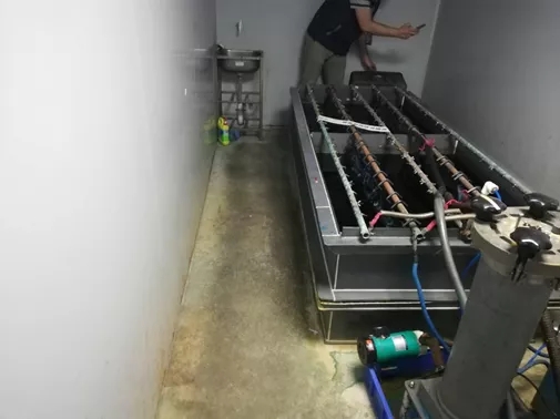 檢查發(fā)現(xiàn),該作坊主要從事五金電鍍業(yè)務(wù),現(xiàn)場未能提供工商營業(yè)執(zhí)照,也沒有相關(guān)環(huán)保審批、驗(yàn)收手續(xù)。該電鍍作坊是一間置于民房天臺的單層活動板房,有黑色網(wǎng)布遮掩,板房的加工區(qū)域設(shè)有三重門禁,電鍍工序設(shè)置在最內(nèi)層的密室中。執(zhí)法人員進(jìn)入密室后,發(fā)現(xiàn)兩條正在工作的電鍍槽。