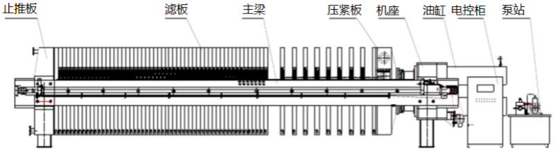 快開(kāi)式壓濾機(jī)主要由過(guò)濾機(jī)設(shè)備架、過(guò)濾部分、液壓部分、電氣控制和卸料機(jī)構(gòu)等,其中過(guò)濾機(jī)設(shè)備架是壓濾機(jī)的基礎(chǔ)構(gòu)建,由主梁、油缸、止推板等部件組成;過(guò)濾部分由濾板、濾布和配板等組成,電氣控制部分主要由電控柜、開(kāi)關(guān)等一系列電氣元件組成;卸料機(jī)構(gòu)由傳動(dòng)機(jī)構(gòu)、驅(qū)動(dòng)機(jī)構(gòu)等組成。
