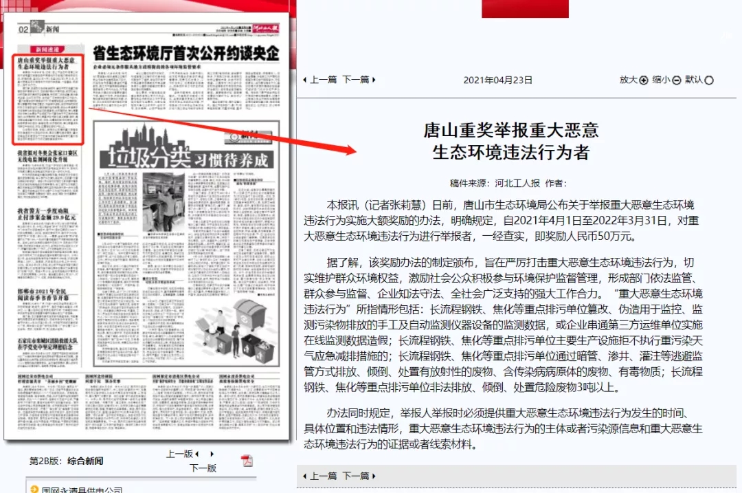 日前,唐山市生態(tài)環(huán)境局公布關(guān)于舉報(bào)重大惡意生態(tài)環(huán)境違法行為實(shí)施大額獎(jiǎng)勵(lì)的辦法,明確規(guī)定,自2021年4月1日至2022年3月31日,對(duì)重大惡意生態(tài)環(huán)境違法行為進(jìn)行舉報(bào)者,一經(jīng)查實(shí),即獎(jiǎng)勵(lì)人民幣50萬元。