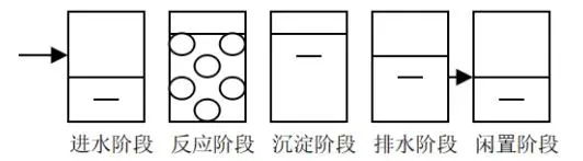 根據(jù)時(shí)間進(jìn)行劃分的間歇式活性污泥法可統(tǒng)稱(chēng)為SBR法。典型SBR工藝過(guò)程的一個(gè)完整運(yùn)行包括五個(gè)階段,依次為:進(jìn)水階段-加入基質(zhì);反應(yīng)階段-基質(zhì)降解;沉淀階段-泥水分離;排水階段-排出上清液;閑置階段-等待下一次進(jìn)水。SBR法污水處理工藝流程如圖2所示。