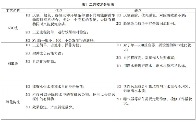 A2/O工藝、SBR工藝和氧化溝工藝的工藝技術(shù)分析和技術(shù)參數(shù)分析見(jiàn)表1和表2。