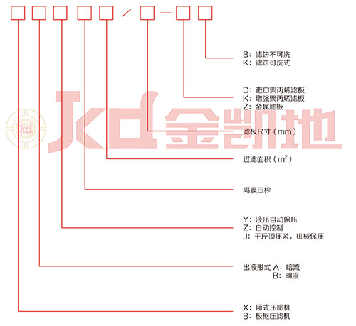 S代表過濾面積,Q代表千斤頂壓緊,J代表千斤頂壓緊,機(jī)械保壓,Y代表自動(dòng)壓液壓壓緊,Z代表自動(dòng)壓濾機(jī),D代表圓形濾板,K代表增強(qiáng)聚丙烯濾板,T代表金屬材質(zhì)濾板。